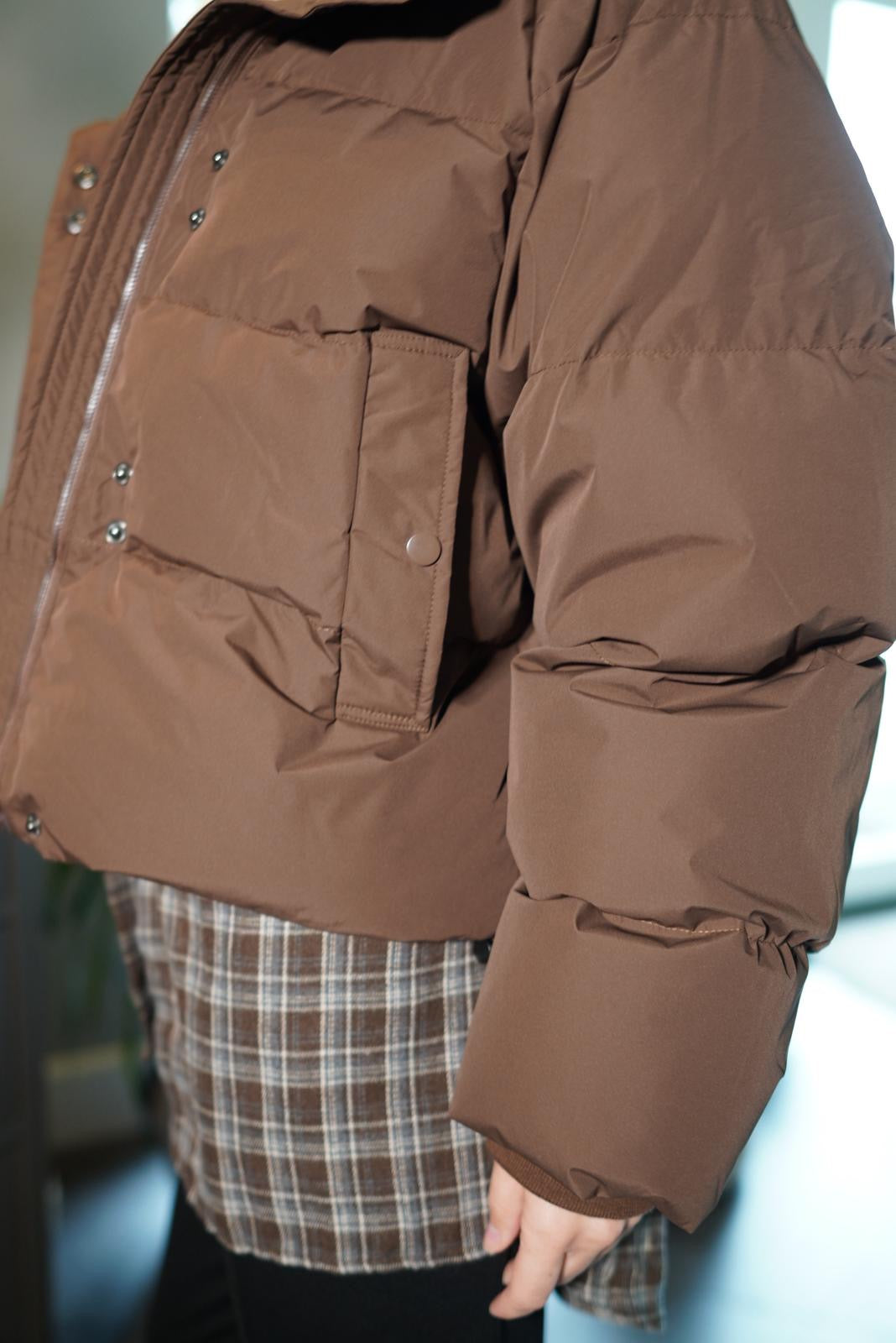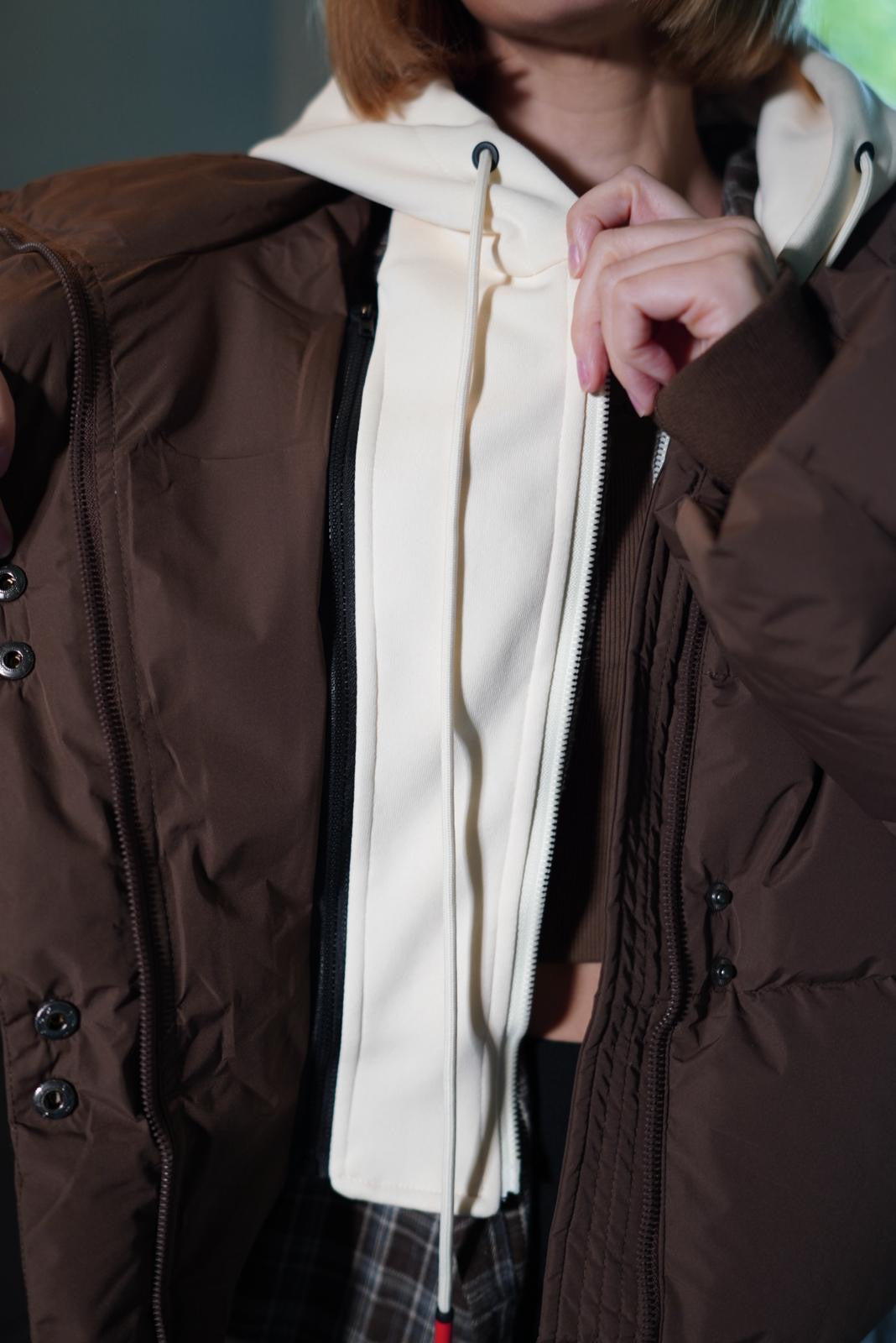 Virsjaka ar odziņu - iestrādātu hūdija tipa kapuci. Silta, oversize tipa un šīs sezonas aktuālajā šokolādes brūnajā krāsā. Iestrādāto jaciņu vari ērti noņemt nost ar rāvējslēdzēju.