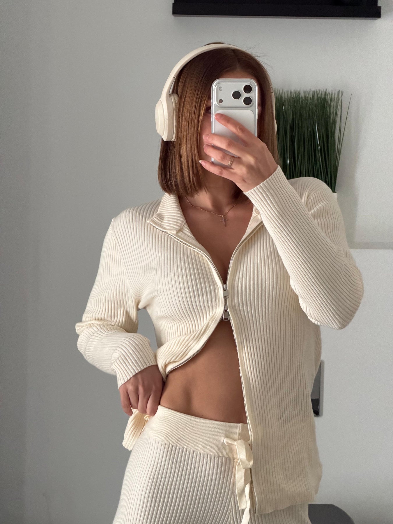 Mīksts, ļoti elastīgs un ērts komplekts, kas pielāgosies katras ķermeņa aprisēm. Biksēm jostasvietā gan elastīga gumija, gan šņorīte, ja nepieciešams papildus savilkt. Jaciņai divpusējs rāvējslēdzis. Izcili izskatīsies arī sadalot un nēsājot topu ar džinsa biksēm visās Latvijas sezonas.